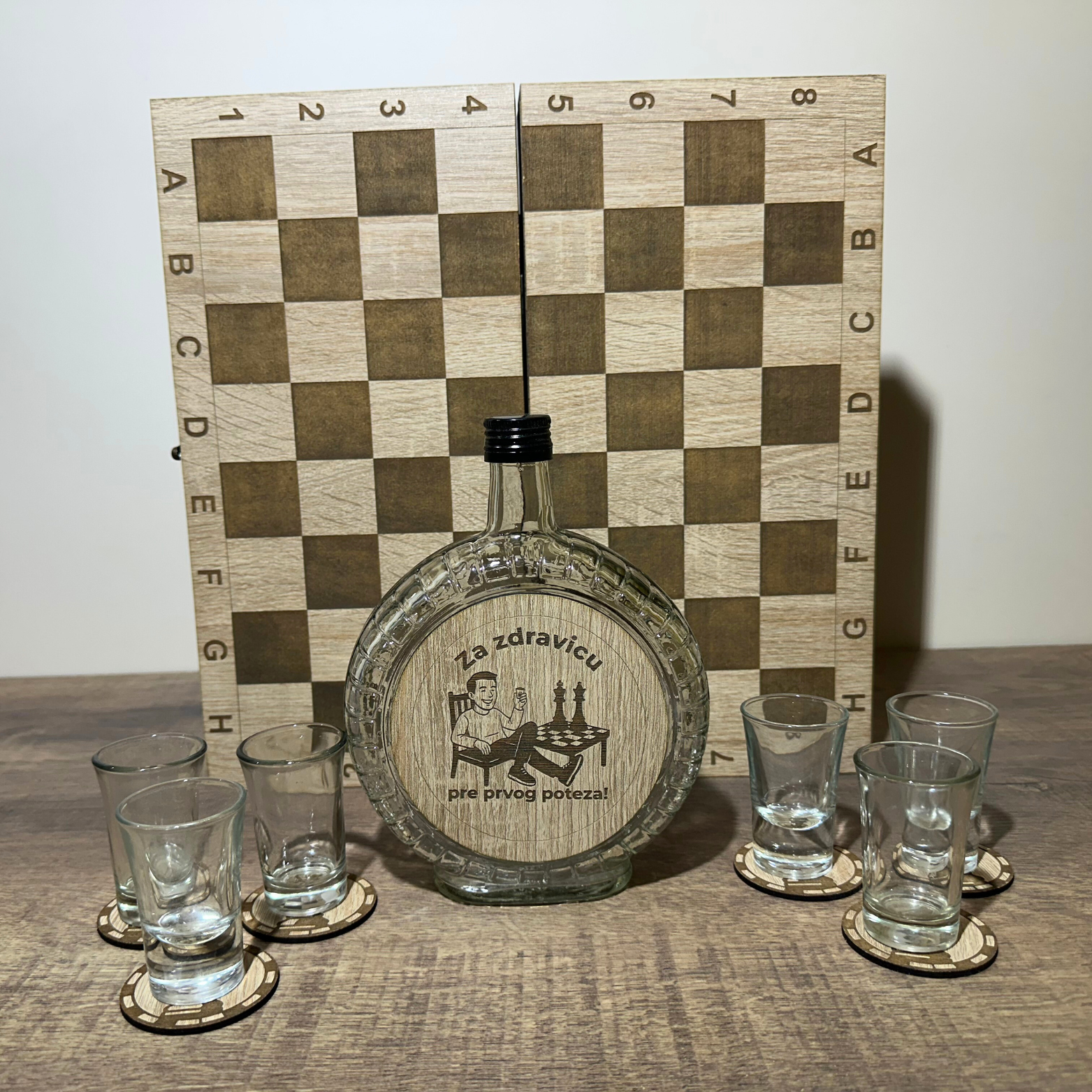 Unikatan set koji sadrži šah kutiju, čuturu i šest čašica predstavlja odličan način da obeležite posebne trenutke i iznenadite voljenu osobu. Ovaj praktičan i elegantan poklon kombinuje kvalitet, stil i funkcionalnost, pretvarajući svaki gest pažnje u nezaboravno iskustvo. Bilo da slavite rođendan, jubilej, slavu ili želite da obradujete dragu osobu bez povoda – ovaj set uvek ostavlja snažan utisak.